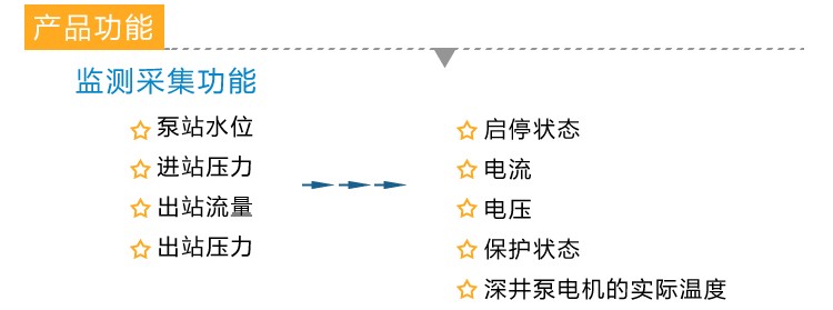 泵站管理人员可以在泵站监控中心远程监测站内液体液位或进站压力、泵组工作状态、出站流量、出站压力等;支持泵启动设备手动控制、自动控制、远程控制泵组的启停;通过与视频监控系统相连,还可图像监视站内全景或重要工位,实现泵站无人值守。