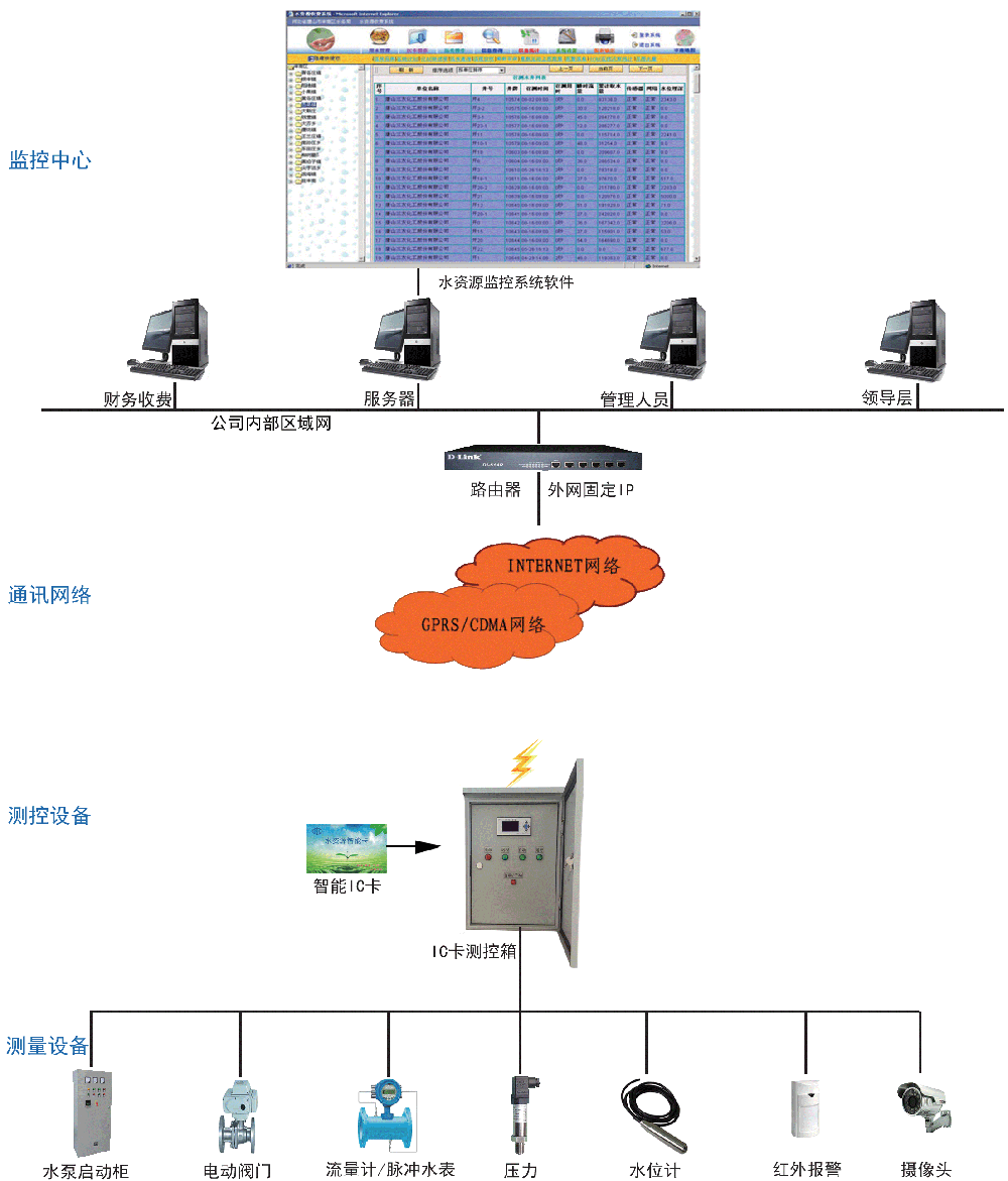 系统简介 水资源实时远程监控管理系统是应用在水务部门的一套智能化管理系统,它通过对用水单位的实时监测与控制,有效的保护水资源、合理利用水资源、加强用水单位的节水意识,是一套在水务行业中的理想解决方案。 系统组成 v 中心接收部分:中心服务器、固定外网IP、水资源管理系统软件; v 传输网络:移动或电信网络; v 采集控制终端:水文水资源遥测终端RTU; v 仪表部分:流量计/积算仪、水位计、压力变送器、控制柜/电动阀门; v 供电方式:市电、太阳能供电、电池供电。