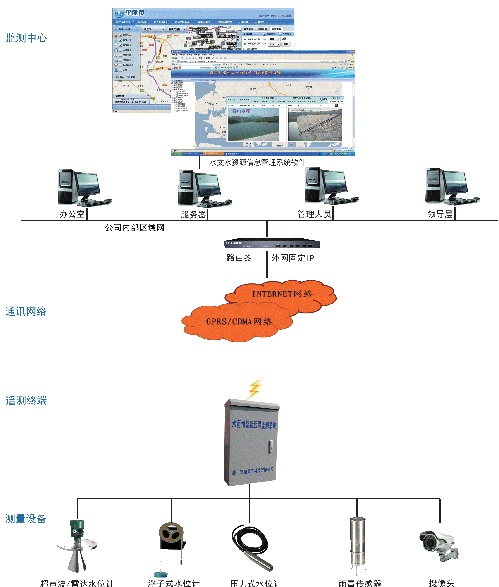 一、系统简介 “水文水资源信息化管理系统”是一套率先以新的水文数据库国家标准为基础、采用了多项先进技术应用于水文信息化管理的应用解决方案,将较大地提高雨情、水情、旱情和灾情信息的综合利用率,为水文部门的调度决策提供科学依据。 二、系统组成 v 监控中心:中心服务器、外网固定IP、水文水资源管信息化管理系统软件; v 通信网络: 基于移动或者电信的通信网络平台、北斗卫星; v 遥测终端:水文水资源遥测终端RTU v 测量仪表:水位计、雨量传感器、摄像头; v 供电方式:市电、太阳能供电、电池供电。