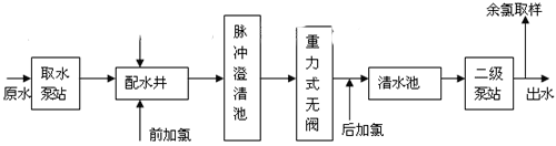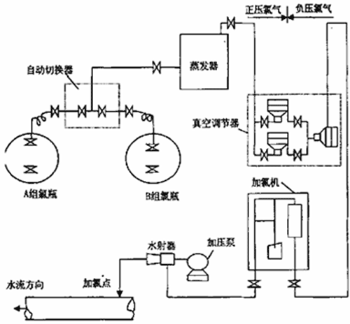 图2 加氯工作流程图 如图2示:前加氯系统与后加氯系统共用一个氯气气源,共设两组供氯氯瓶,两组氯瓶互为备用.,根据气瓶压力自动切换。如当正在使用的一组氯瓶出口管上的压力小于某个值时,压力式自动切换器将自动切换到另一组氯瓶,保证连续供氯。在加氯自动控制系统中,将PLC的模拟量输出信号送给加氯机的模拟量输入端,通过控制加氯机中执行器的动作,控制水射器中的真空度,进而控制了加氯量的大小。加氯自动控制系统中还包括氯气气源的自动切换,漏气自动报警和漏氯吸收装置的自动控制。在加氯自动控制系统中,关键是对加氯机的控制。 自动控制氯系统可进一步配备计算机数据采集系统,以便实现加氯间无人值班目标。把出厂水中的余氯分析仪测定的数据送到加氯间,中心化验室和调度室,以便值班人员可随时监测出厂水余氯值和调整余氯设定值。 3影响加氯自动控制的主要原因(1)采样时间 采样时间的长短,直接影响加氯的效果。为了达到自动控制的目的,要求氯气经充分混合后马上检查余氯值作为复合环控制的反馈信号。但现场中,有的工艺设计将混合接触时间定的太长,对控制系统来说,即意味着纯滞后时间的延长,造成测定结果不准确。因此,在后加氯的投加点和采样点的选择上,工艺设计时应充分考虑自动控制的要求。通常情况下,后加氯在清水池进水管上,在氯气与水充分混合后应在尽可能短的时间内取样,水经过加氯点到余氯分析仪处的水流时间一般不要超过5分钟,在水与氯气充分混合的前提下取样时间越短越好。可用如下二种方法论缩短取样时间:一是缩短取样管的长度;二是加快取样管中的水流速度如加大取样水管排水分流管。(2)检测设备 余氯分析仪的检测值的正确性也是控制加氯的关键。由于余氯分析仪存在零点漂移,应定期进行校正。同时在软件编制时,对信号数据的处理也可考虑滤波、稳定等形式进行适当处理以增加数据的可靠性。(3)信号传输 主要是各底层设备的检测信号要及时准确的传输到PLC中,然后进行处理。现场中大都设备采用标准电流信号(0―20mA或4―20mA)。4 自动加氯系统的应用 南方某一水厂,以江水为水源,水厂原设计规模为6万m3/d。工艺流程如下示: